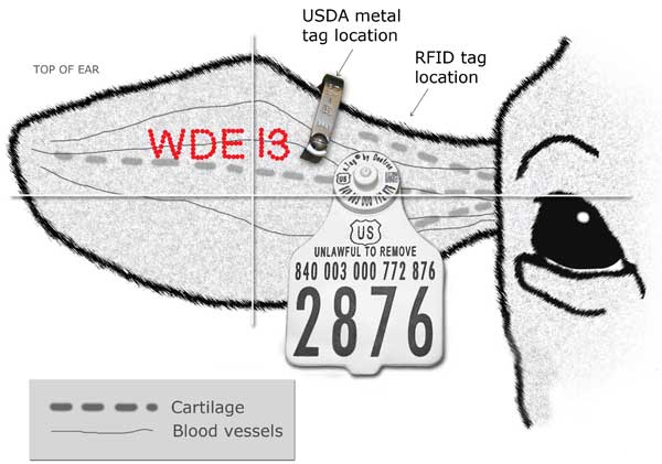 Yes. See illustration for typical tag placement. For exhibitors of colored breed cattle with tattoos, World Dairy Expo recommends those tagging cattle to determine a placement that will not obscure or make unreadable, an important official identification number for show check-in purposes. Depending upon where a breed tattoo is already located, it may be necessary to place an accepted WDE-defined ID tag for health check-in, in the left ear.